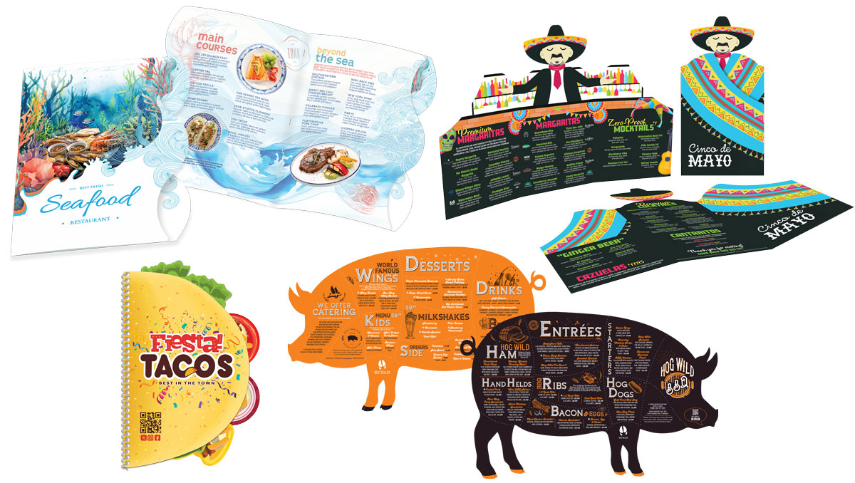 MenuWorks offers a variety of Specialty-Shaped Menus. These menus are designed to be attention-getting while highlighting your brand. Specialty-Shaped Menus are available in flat, folded and coil options. Full color, sharp digitally printed graphics and printing go all the way to the edge for a clean, consistent design. As with all our laminated, synthetic menus, specialty-shaped menus are waterproof – and washable for trouble-free cleaning.